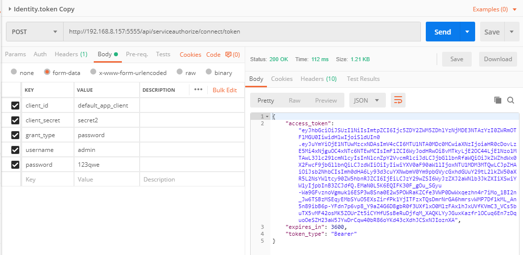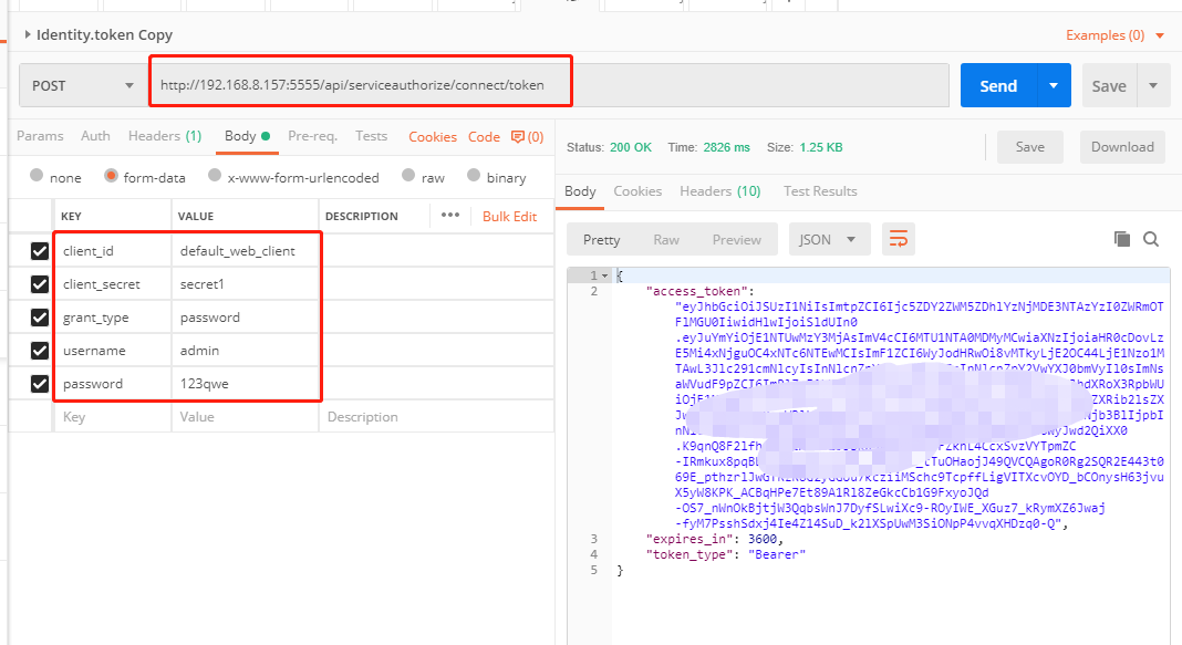 首先请求token,地址填写api网关地址,client_id、client_secret和权限服务中设置的一致,其他按下图填写