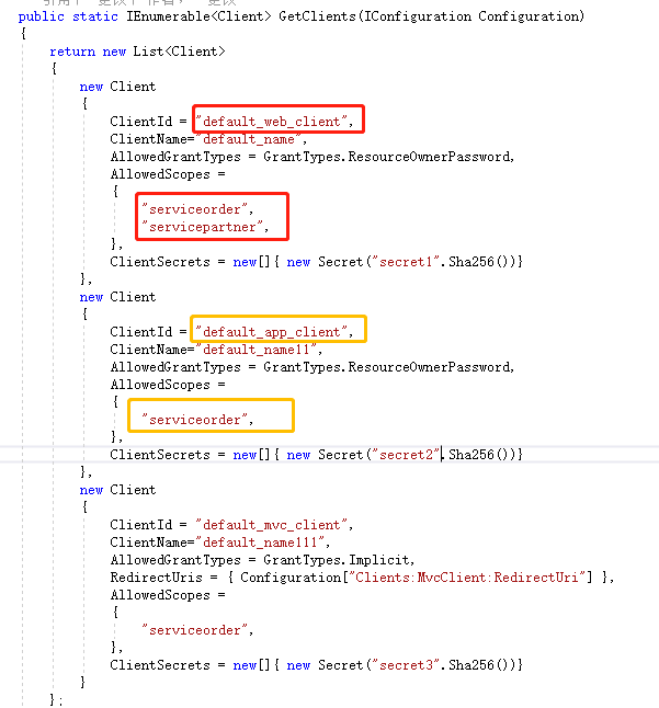 public static class IdentityServerConfig { /// <summary> /// 允许使用认证服务的api列表 /// </summary> /// <returns></returns> public static IEnumerable<ApiResource> GetApiResources() { return new List<ApiResource> { new ApiResource("serviceorder", "Default (all) API"), new ApiResource("servicepartner", "Default (all) API1"), }; } /// <summary> /// /// </summary> /// <returns></returns> public static IEnumerable<IdentityResource> GetIdentityResources() { return new List<IdentityResource> { new IdentityResources.OpenId(), new IdentityResources.Profile(), new IdentityResources.Email(), new IdentityResources.Phone() }; } /// <summary> /// 允许使用认证服务的应用客户端 /// </summary> /// <returns></returns> public static IEnumerable<Client> GetClients(IConfiguration Configuration) { return new List<Client> { new Client { ClientId = "default_web_client", ClientName="default_name", AllowedGrantTypes = GrantTypes.ResourceOwnerPassword, AllowedScopes = { "serviceorder", "servicepartner", }, ClientSecrets = new[]{ new Secret("secret1".Sha256())} }, new Client { ClientId = "default_app_client", ClientName="default_name11", AllowedGrantTypes = GrantTypes.ResourceOwnerPassword, AllowedScopes = { "serviceorder", }, ClientSecrets = new[]{ new Secret("secret2".Sha256())} }, new Client { ClientId = "default_mvc_client", ClientName="default_name111", AllowedGrantTypes = GrantTypes.Implicit, RedirectUris = { Configuration["Clients:MvcClient:RedirectUri"] }, AllowedScopes = { "serviceorder", }, ClientSecrets = new[]{ new Secret("secret3".Sha256())} } }; } }