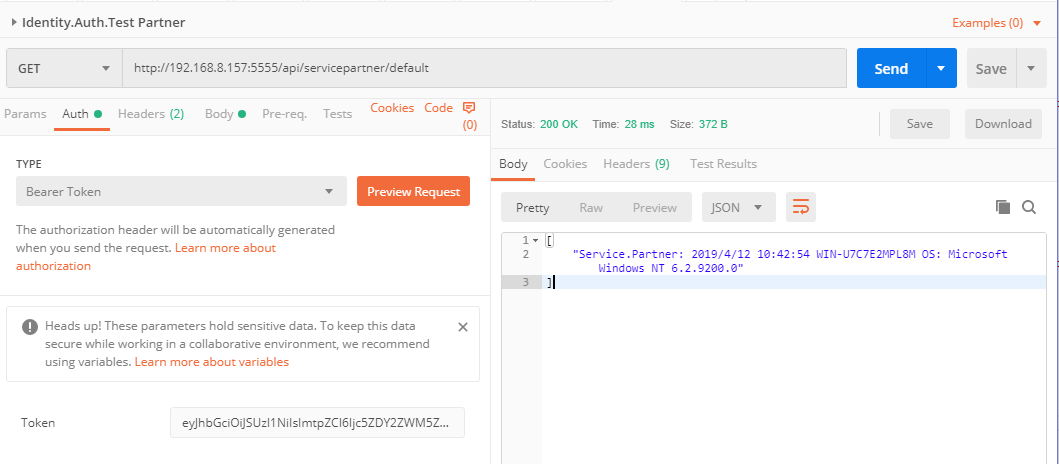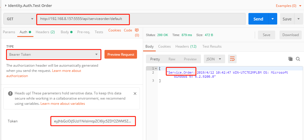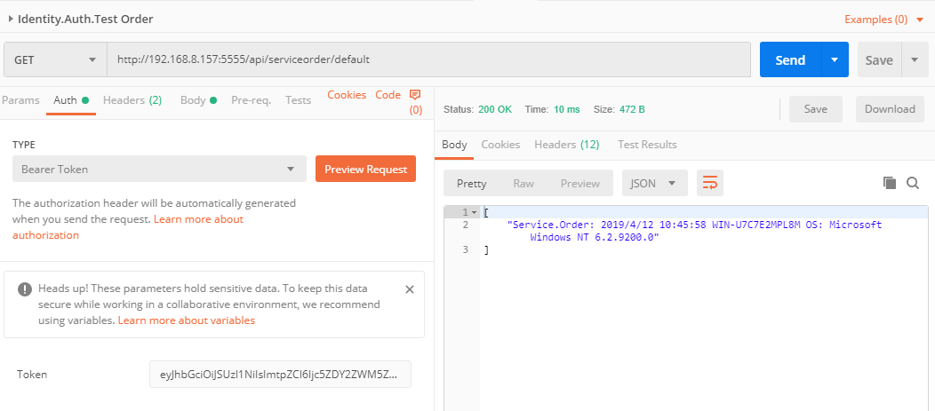 请求serviceorder,可以正常获得结果,注意在Auth选项卡中选择Bearer Token并填写刚才取得的access_token