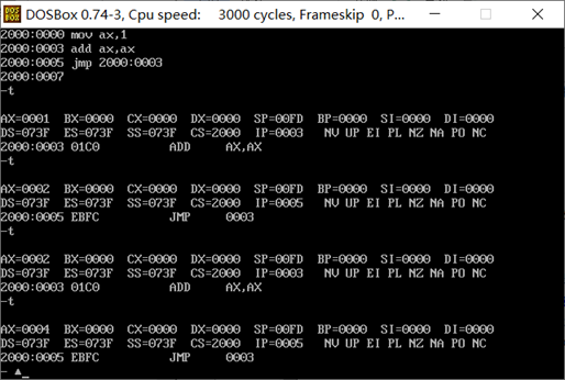 单步调试每一行汇编指令的截图。每一条指令单步调试后,都使用 d 命令查看 2000:0~2000:f 的值。观察每一条指令执行后相关寄存器值的变化,及 2000:0~2000:f 单元值的变化。