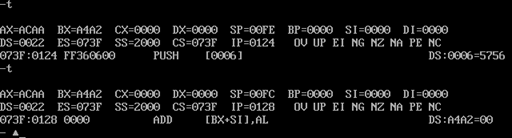 由于mov ss,**指令的特定,执行mov ss,ax 时其后边的指令将立即被执行。至于指令执行后靠近栈顶的10个字节中值立即有了变化,是对定义栈段时部分运行环境变量进行暂存,靠近栈顶的10个字节中的暂存数据分别是SS、IP、 CS 等的值。