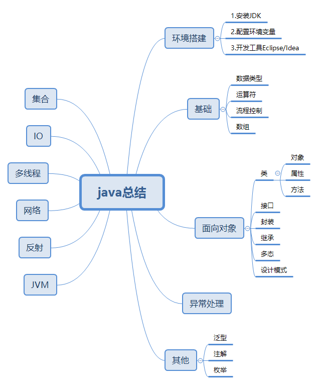 学习编程好多年了,看了很多相关的书,教学视频,网上资料,也做过一些项目。平时偶有一些感悟,或因工作忙,或因自己懒惰,大部分都没能记下来。人的精力是有限的,长此以往,总感觉想像狗熊掰棒子,学新忘旧。人生在世,总要有一技之长,不然到老的时候,就会落得“人活着,钱没了”的悲惨境地。少壮不努力,老大徒伤悲。古人云:欲求木之长者,必固其根本;欲流之远者,必浚其泉源;Java是我第一门学习比较深入的编程语言,趁着空闲,又学习了一遍基础,温故知新,但以后恐怕没那么多闲工夫了。复用是编程的重要思想之一,学习中也可以加以利用。将重要的知识记录下来,等需要的时候翻看一遍即可,省去了看视频,搜寻资料的时间,你所要做的就是给大脑做一个索引,知道在哪里找即可。由于人的大脑更喜欢图形,图像,因此用思维导图等方式做总结笔记会更加高效。总结会时常更新。