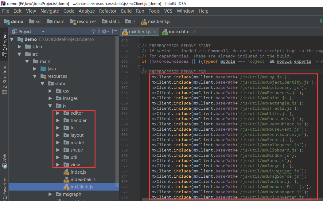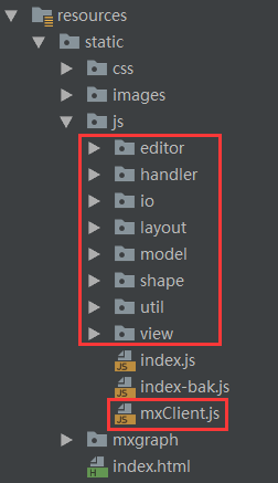 从下载的文件中可以获得一系列的js文件,将js文件复制到项目中,在html中引用mxClient.js(mxClient.js会引用其他的工具类)
