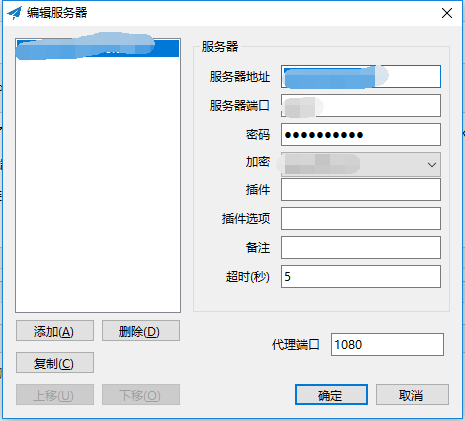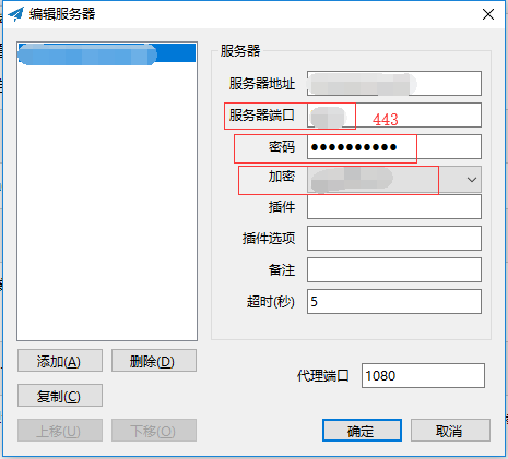 服务端口、密码、加密都跟我们在服务端的命令参数或配置文件中保持一致,点击确定后,一个服务便建立好了