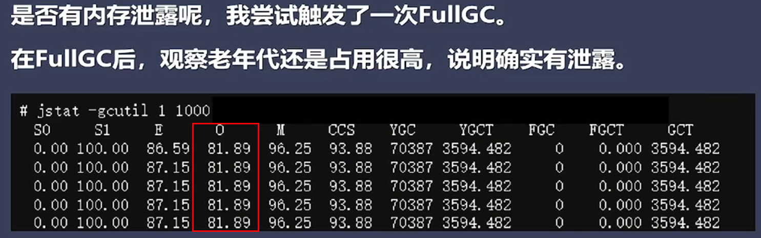 1、触发一次fullgc后,老年代占比还是较高,说明确实有泄漏