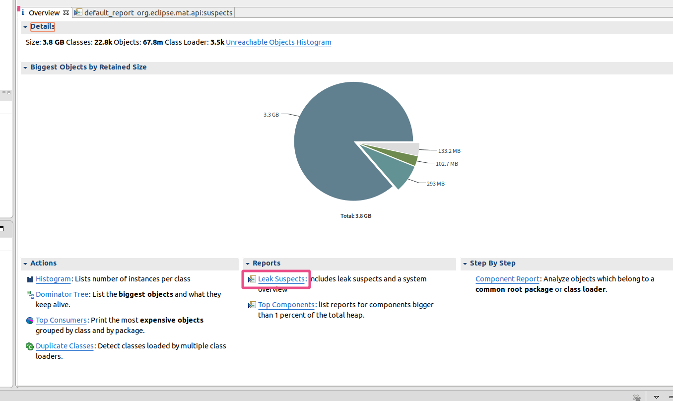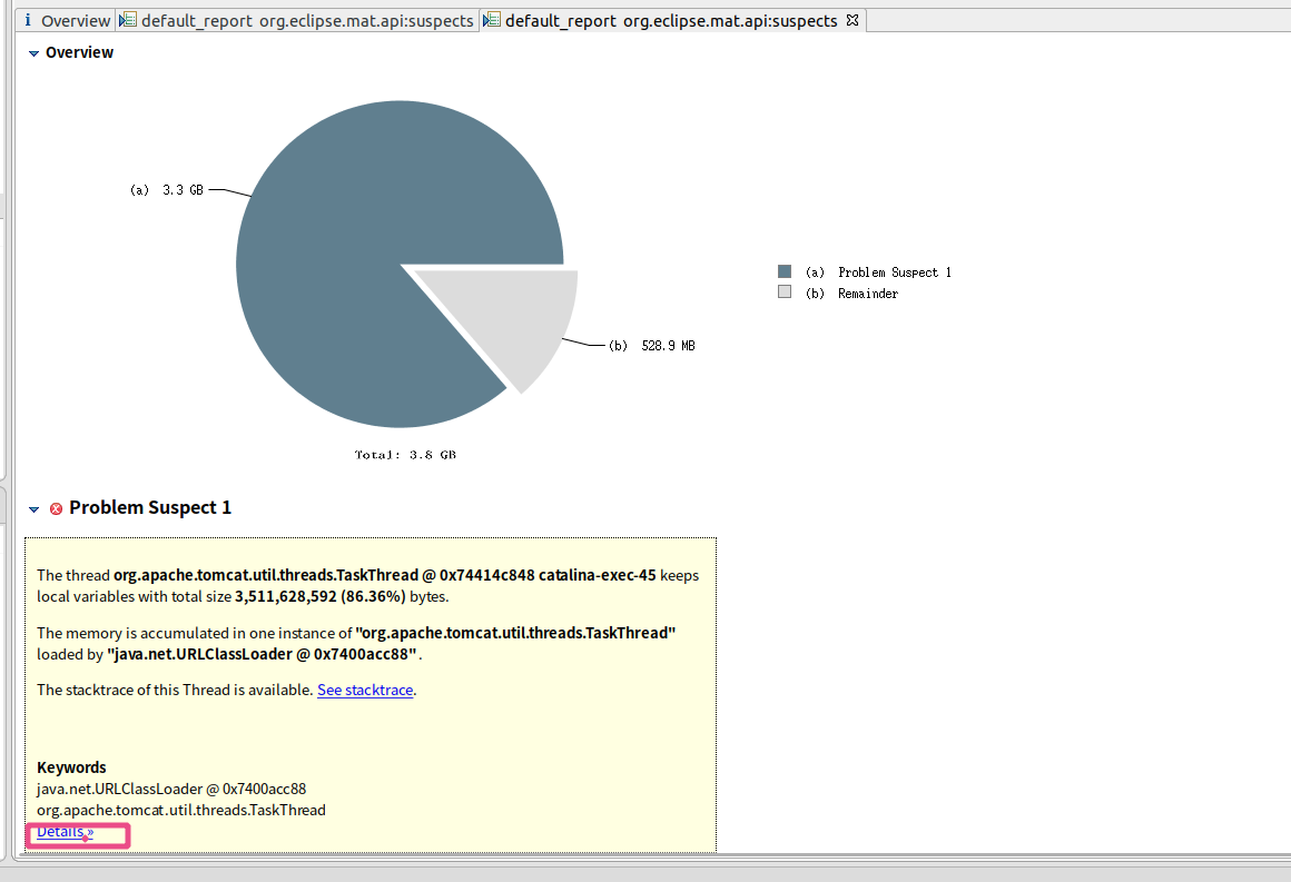 - mat这个工具很强大,帮我们分析到了leak的可疑点;打开文件找到{{leak suspects}}