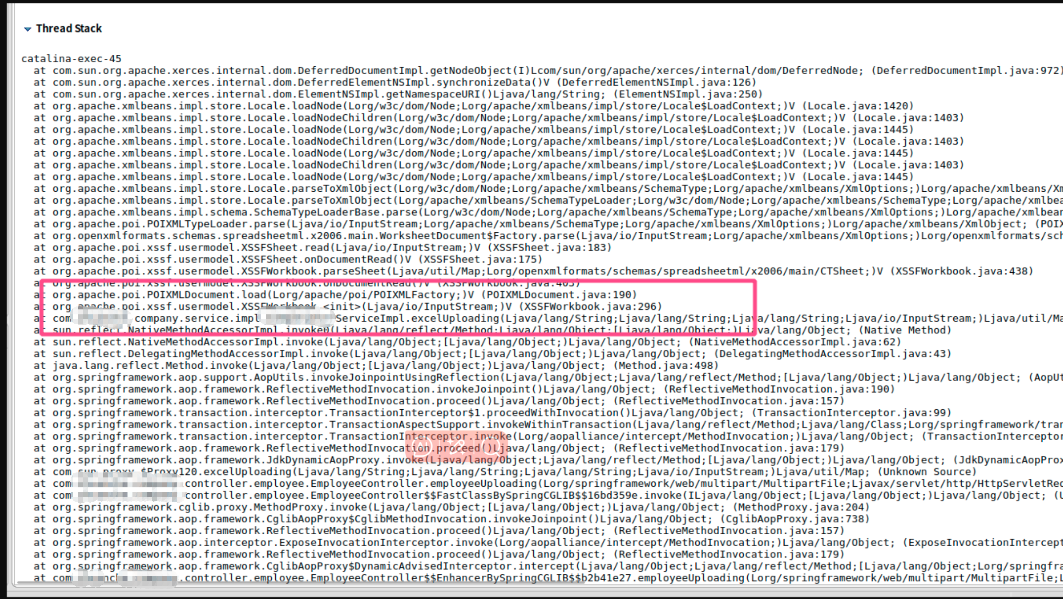 线程栈信息表明是poi这个插件在读取文件时发生了内存泄漏,随后定位到问题代码,这是一段上传excel批量添加员工的操作,检查对应的excel发现只是单sheet150行记录,理论上pom在解析文件时不会发生内存泄漏,就在百思不得其解之时,偶然发现文件大小高达15M,显然不是150行记录的量,原来是文件的锅,excel中存在大量空白行,致使文件过大,最终导致poi在解析大文件时内存泄漏,需要频繁的full gc。