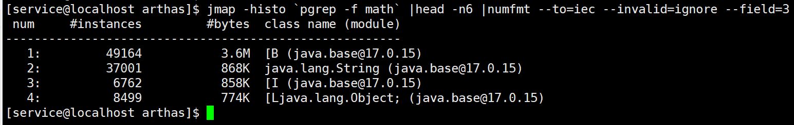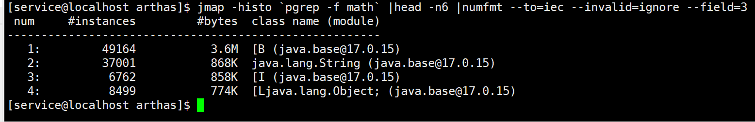jmap -histo `pgrep -f math` |head -n6 |numfmt --to=iec --invalid=ignore --field=3