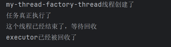 static class MyThreadFactory implements ThreadFactory { @Override public Thread newThread(Runnable r) { Runnable newRunnable = () -> { System.out.println("任务真正执行了"); r.run(); }; // 给线程命名 Thread thread = new Thread(newRunnable, "my-thread-factory-thread"); System.out.println("my-thread-factory-thread线程创建了"); return thread; } }