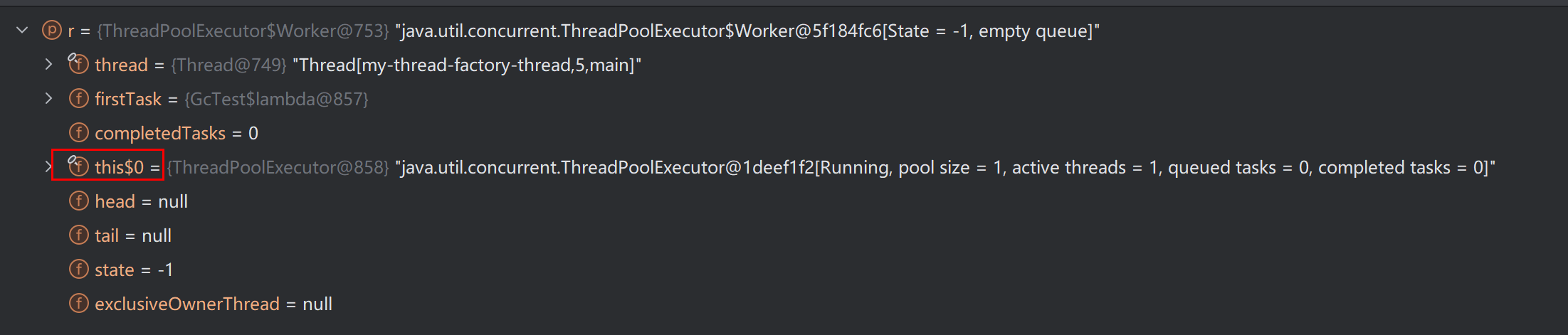 也就是我们的线程,它里面有一个runnable,这个runnable是一个内部类,于是这个runnable引用了当前这对象(线程池)