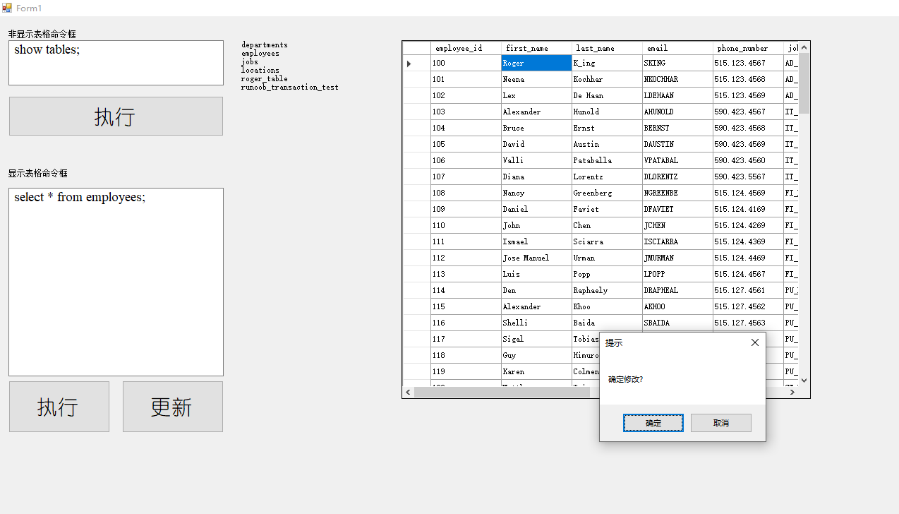 using System; using System.Collections.Generic; using System.ComponentModel; using System.Data; using System.Drawing; using System.Linq; using System.Text; using System.Threading.Tasks; using System.Windows.Forms; using MySql.Data.MySqlClient; namespace MySQL_NET { public partial class Form1 : Form { MySqlConnection conn; string command_string; public Form1() { InitializeComponent(); String connetStr = "server=127.0.0.1;port=3306;user=root;password=123456;SslMode = none;"; // server=127.0.0.1/localhost 代表本机,端口号port默认是3306可以不写 conn = new MySqlConnection(connetStr); try { conn.Open();//打开通道,建立连接,可能出现异常,使用try catch语句 MessageBox.Show("已经建立连接"); //在这里使用代码对数据库进行增删查改 } catch (MySqlException ex) { MessageBox.Show(ex.Message); switch (ex.Number) { case 0: MessageBox.Show("Cannot connect to server. Contact administrator"); break; case 1045: MessageBox.Show("Invalid username/password, please try again"); break; } } finally { //conn.Close(); } } private void Form1_FormClosing(object sender, FormClosingEventArgs e) { conn.Close(); } MySqlCommand cmd; private void slim_excute_Btn_Click(object sender, EventArgs e) { try { if (slim_Command_textBox != null) { result_label.Text = ""; command_string = slim_Command_textBox.Text; using (cmd = new MySqlCommand(command_string, conn)) { MySqlDataReader reader = cmd.ExecuteReader();//执行ExecuteReader()返回一个MySqlDataReader对象 while (reader.Read())//初始索引是-1,执行读取下一行数据,返回值是bool { //Console.WriteLine(reader[0].ToString() + reader[1].ToString() + reader[2].ToString()); //Console.WriteLine(reader.GetInt32(0)+reader.GetString(1)+reader.GetString(2)); result_label.Text += reader[0].ToString() + "\n"; //"userid"是数据库对应的列名,推荐这种方式 } reader.Close(); } } } catch (Exception ex) { MessageBox.Show(ex.Message); } } MySqlDataAdapter adapter; DataSet set; private void excute_Btn_Click(object sender, EventArgs e) { try { if (Command_textBox != null) { //command_string = ""; command_string = Command_textBox.Text; using (adapter = new MySqlDataAdapter(command_string, conn)) { set = new DataSet(); adapter.Fill(set, "测试"); if (set != null) { dataGridView1.DataSource = set; dataGridView1.DataMember = "测试"; } } } } catch (Exception ex) { MessageBox.Show(ex.Message); } } private void updateBtn_Click(object sender, EventArgs e) { if (adapter == null || set == null) //先导入数据才能更新数据。 { MessageBox.Show("请先导入数据"); return; } try { string msg = "确实要更新吗?"; if (1 == (int)MessageBox.Show(msg, "提示", MessageBoxButtons.OKCancel, MessageBoxIcon.Exclamation)) { MySqlCommandBuilder builder = new MySqlCommandBuilder(adapter); //命令生成器。 adapter.Update(set, "测试"); MessageBox.Show("更新成功", "提示"); } } catch (Exception ex) { MessageBox.Show(ex.ToString(), "错误信息"); } } Object cellTempValue = null; private void dataGridView1_CellBeginEdit(object sender, DataGridViewCellCancelEventArgs e) { cellTempValue = dataGridView1.Rows[e.RowIndex].Cells[e.ColumnIndex].Value; } private void dataGridView1_CellEndEdit(object sender, DataGridViewCellEventArgs e) { if (Object.Equals(cellTempValue, dataGridView1.Rows[e.RowIndex].Cells[e.ColumnIndex].Value)) { //如果没有修改,则返回 return; } //判断用户是否确定修改 if (MessageBox.Show("确定修改?", "提示", MessageBoxButtons.OKCancel, MessageBoxIcon.None) != DialogResult.OK) { //如果不修改,恢复原来的值 dataGridView1.Rows[e.RowIndex].Cells[e.ColumnIndex].Value = cellTempValue; return; } else { //如果修改,则获取表头。用于数据库更新 } Console.WriteLine(dataGridView1.Columns[e.ColumnIndex].DataPropertyName); Console.WriteLine(dataGridView1.Rows[e.RowIndex].Cells[e.ColumnIndex].Value); Console.WriteLine(dataGridView1.Rows[e.RowIndex].Cells[0].Value); //修改数据库的数据 string sql = String.Format("update employees set {0}='{1}' where employee_id ='{2}'", dataGridView1.Columns[e.ColumnIndex].DataPropertyName.ToString(), //所选单元格列名 dataGridView1.Rows[e.RowIndex].Cells[e.ColumnIndex].Value.ToString(), //所选单元格修改后的值 dataGridView1.Rows[e.RowIndex].Cells[0].Value.ToString() //所选行的商品编号 ); using (cmd = new MySqlCommand(sql, conn)) { MySqlDataReader reader = cmd.ExecuteReader();//执行ExecuteReader()返回一个MySqlDataReader对象 while (reader.Read())//初始索引是-1,执行读取下一行数据,返回值是bool { //Console.WriteLine(reader[0].ToString() + reader[1].ToString() + reader[2].ToString()); //Console.WriteLine(reader.GetInt32(0)+reader.GetString(1)+reader.GetString(2)); result_label.Text += reader[0].ToString() + "\n"; //"userid"是数据库对应的列名,推荐这种方式 } reader.Close(); } } } }