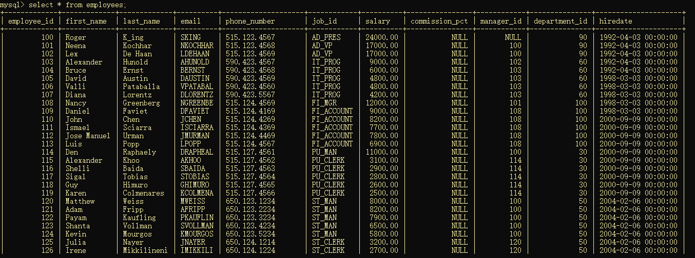 /* SQLyog Ultimate v10.00 Beta1 MySQL - 5.5.15 : Database - myemployees ********************************************************************* */ /*!40101 SET NAMES utf8 */; /*!40101 SET SQL_MODE=''*/; /*!40014 SET @OLD_UNIQUE_CHECKS=@@UNIQUE_CHECKS, UNIQUE_CHECKS=0 */; /*!40014 SET @OLD_FOREIGN_KEY_CHECKS=@@FOREIGN_KEY_CHECKS, FOREIGN_KEY_CHECKS=0 */; /*!40101 SET @OLD_SQL_MODE=@@SQL_MODE, SQL_MODE='NO_AUTO_VALUE_ON_ZERO' */; /*!40111 SET @OLD_SQL_NOTES=@@SQL_NOTES, SQL_NOTES=0 */; CREATE DATABASE /*!32312 IF NOT EXISTS*/`myemployees` /*!40100 DEFAULT CHARACTER SET gb2312 */; USE `myemployees`; /*Table structure for table `departments` */ DROP TABLE IF EXISTS `departments`; CREATE TABLE `departments` ( `department_id` INT(4) NOT NULL AUTO_INCREMENT, `department_name` VARCHAR(3) DEFAULT NULL, `manager_id` INT(6) DEFAULT NULL, `location_id` INT(4) DEFAULT NULL, PRIMARY KEY (`department_id`), KEY `loc_id_fk` (`location_id`), CONSTRAINT `loc_id_fk` FOREIGN KEY (`location_id`) REFERENCES `locations` (`location_id`) ) ENGINE=INNODB AUTO_INCREMENT=271 DEFAULT CHARSET=gb2312; /*Data for the table `departments` */ insert into `departments`(`department_id`,`department_name`,`manager_id`,`location_id`) values (10,'Adm',200,1700),(20,'Mar',201,1800),(30,'Pur',114,1700),(40,'Hum',203,2400),(50,'Shi',121,1500),(60,'IT',103,1400),(70,'Pub',204,2700),(80,'Sal',145,2500),(90,'Exe',100,1700),(100,'Fin',108,1700),(110,'Acc',205,1700),(120,'Tre',NULL,1700),(130,'Cor',NULL,1700),(140,'Con',NULL,1700),(150,'Sha',NULL,1700),(160,'Ben',NULL,1700),(170,'Man',NULL,1700),(180,'Con',NULL,1700),(190,'Con',NULL,1700),(200,'Ope',NULL,1700),(210,'IT ',NULL,1700),(220,'NOC',NULL,1700),(230,'IT ',NULL,1700),(240,'Gov',NULL,1700),(250,'Ret',NULL,1700),(260,'Rec',NULL,1700),(270,'Pay',NULL,1700); /*Table structure for table `employees` */ DROP TABLE IF EXISTS `employees`; CREATE TABLE `employees` ( `employee_id` int(6) NOT NULL AUTO_INCREMENT, `first_name` varchar(20) DEFAULT NULL, `last_name` varchar(25) DEFAULT NULL, `email` varchar(25) DEFAULT NULL, `phone_number` varchar(20) DEFAULT NULL, `job_id` varchar(10) DEFAULT NULL, `salary` double(10,2) DEFAULT NULL, `commission_pct` double(4,2) DEFAULT NULL, `manager_id` int(6) DEFAULT NULL, `department_id` int(4) DEFAULT NULL, `hiredate` datetime DEFAULT NULL, PRIMARY KEY (`employee_id`), KEY `dept_id_fk` (`department_id`), KEY `job_id_fk` (`job_id`), CONSTRAINT `dept_id_fk` FOREIGN KEY (`department_id`) REFERENCES `departments` (`department_id`), CONSTRAINT `job_id_fk` FOREIGN KEY (`job_id`) REFERENCES `jobs` (`job_id`) ) ENGINE=InnoDB AUTO_INCREMENT=207 DEFAULT CHARSET=gb2312; /*Data for the table `employees` */ insert into `employees`(`employee_id`,`first_name`,`last_name`,`email`,`phone_number`,`job_id`,`salary`,`commission_pct`,`manager_id`,`department_id`,`hiredate`) values (100,'Steven','K_ing','SKING','515.123.4567','AD_PRES',24000.00,NULL,NULL,90,'1992-04-03 00:00:00'),(101,'Neena','Kochhar','NKOCHHAR','515.123.4568','AD_VP',17000.00,NULL,100,90,'1992-04-03 00:00:00'),(102,'Lex','De Haan','LDEHAAN','515.123.4569','AD_VP',17000.00,NULL,100,90,'1992-04-03 00:00:00'),(103,'Alexander','Hunold','AHUNOLD','590.423.4567','IT_PROG',9000.00,NULL,102,60,'1992-04-03 00:00:00'),(104,'Bruce','Ernst','BERNST','590.423.4568','IT_PROG',6000.00,NULL,103,60,'1992-04-03 00:00:00'),(105,'David','Austin','DAUSTIN','590.423.4569','IT_PROG',4800.00,NULL,103,60,'1998-03-03 00:00:00'),(106,'Valli','Pataballa','VPATABAL','590.423.4560','IT_PROG',4800.00,NULL,103,60,'1998-03-03 00:00:00'),(107,'Diana','Lorentz','DLORENTZ','590.423.5567','IT_PROG',4200.00,NULL,103,60,'1998-03-03 00:00:00'),(108,'Nancy','Greenberg','NGREENBE','515.124.4569','FI_MGR',12000.00,NULL,101,100,'1998-03-03 00:00:00'),(109,'Daniel','Faviet','DFAVIET','515.124.4169','FI_ACCOUNT',9000.00,NULL,108,100,'1998-03-03 00:00:00'),(110,'John','Chen','JCHEN','515.124.4269','FI_ACCOUNT',8200.00,NULL,108,100,'2000-09-09 00:00:00'),(111,'Ismael','Sciarra','ISCIARRA','515.124.4369','FI_ACCOUNT',7700.00,NULL,108,100,'2000-09-09 00:00:00'),(112,'Jose Manuel','Urman','JMURMAN','515.124.4469','FI_ACCOUNT',7800.00,NULL,108,100,'2000-09-09 00:00:00'),(113,'Luis','Popp','LPOPP','515.124.4567','FI_ACCOUNT',6900.00,NULL,108,100,'2000-09-09 00:00:00'),(114,'Den','Raphaely','DRAPHEAL','515.127.4561','PU_MAN',11000.00,NULL,100,30,'2000-09-09 00:00:00'),(115,'Alexander','Khoo','AKHOO','515.127.4562','PU_CLERK',3100.00,NULL,114,30,'2000-09-09 00:00:00'),(116,'Shelli','Baida','SBAIDA','515.127.4563','PU_CLERK',2900.00,NULL,114,30,'2000-09-09 00:00:00'),(117,'Sigal','Tobias','STOBIAS','515.127.4564','PU_CLERK',2800.00,NULL,114,30,'2000-09-09 00:00:00'),(118,'Guy','Himuro','GHIMURO','515.127.4565','PU_CLERK',2600.00,NULL,114,30,'2000-09-09 00:00:00'),(119,'Karen','Colmenares','KCOLMENA','515.127.4566','PU_CLERK',2500.00,NULL,114,30,'2000-09-09 00:00:00'),(120,'Matthew','Weiss','MWEISS','650.123.1234','ST_MAN',8000.00,NULL,100,50,'2004-02-06 00:00:00'),(121,'Adam','Fripp','AFRIPP','650.123.2234','ST_MAN',8200.00,NULL,100,50,'2004-02-06 00:00:00'),(122,'Payam','Kaufling','PKAUFLIN','650.123.3234','ST_MAN',7900.00,NULL,100,50,'2004-02-06 00:00:00'),(123,'Shanta','Vollman','SVOLLMAN','650.123.4234','ST_MAN',6500.00,NULL,100,50,'2004-02-06 00:00:00'),(124,'Kevin','Mourgos','KMOURGOS','650.123.5234','ST_MAN',5800.00,NULL,100,50,'2004-02-06 00:00:00'),(125,'Julia','Nayer','JNAYER','650.124.1214','ST_CLERK',3200.00,NULL,120,50,'2004-02-06 00:00:00'),(126,'Irene','Mikkilineni','IMIKKILI','650.124.1224','ST_CLERK',2700.00,NULL,120,50,'2004-02-06 00:00:00'),(127,'James','Landry','JLANDRY','650.124.1334','ST_CLERK',2400.00,NULL,120,50,'2004-02-06 00:00:00'),(128,'Steven','Markle','SMARKLE','650.124.1434','ST_CLERK',2200.00,NULL,120,50,'2004-02-06 00:00:00'),(129,'Laura','Bissot','LBISSOT','650.124.5234','ST_CLERK',3300.00,NULL,121,50,'2004-02-06 00:00:00'),(130,'Mozhe','Atkinson','MATKINSO','650.124.6234','ST_CLERK',2800.00,NULL,121,50,'2004-02-06 00:00:00'),(131