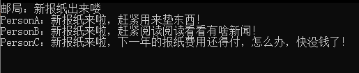 以下为运行结果:可以看到事件只需要触发一次(发报纸喽!),每个订阅者都会随之反应,而且,每个人的反应情况(心路历程)都是不一样的。