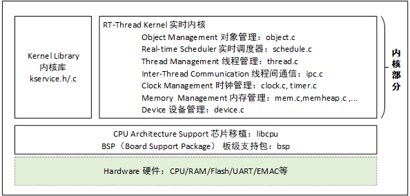 2)实时内核的实现包括:对象管理、线程管理及调度器、线程间通信管理、时钟管理及内存管理等等,内核最小的资源占用情况是 3KB ROM,1.2KB RAM。