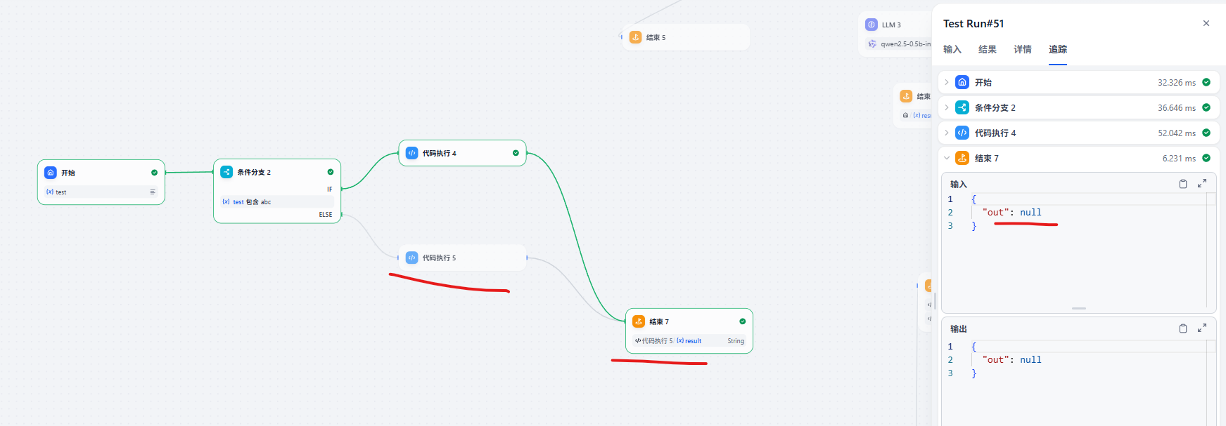 在同一工作流中,可以看到,虽然实际上并未经过“代码节点5”,但是后面的节点仍然可以引用它的变量,只不过收到的内容是null,而不是空字符串。 但测试发现,null可以当成空字符串使用,比如传递给下一个节点。