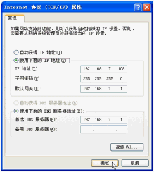 由于我们这台ADSL MODEM的出厂默认值为192.168.7.1(不同的产品可能不同,请参照说明书上的介绍),所以,本地计算机的IP地址可以设置为192.168.7.2-254之间的任何一个,但要注意任意两台计算机的IP地址不能相同;子网掩码为255.255.255.0,默认网关和DNS服务器地址均设置为ADSL MODEM 的IP地址192.168.7.1,“确定”后即完成本地的设置。在实验时我们发现,IP地址设置为自动获取、不设置网关、DNS也设置为自动获取的话,计算机也能正常上网,这是利用了ADSL MODEM的DHCP功能,这一方面会加重ADSL MODEM的负担,造成速度的降低,另一方面会对我们其它的一些网络服务(如FTP等)造成不必要的麻烦,因此在这里不推荐大家采用自动获取的设置。
