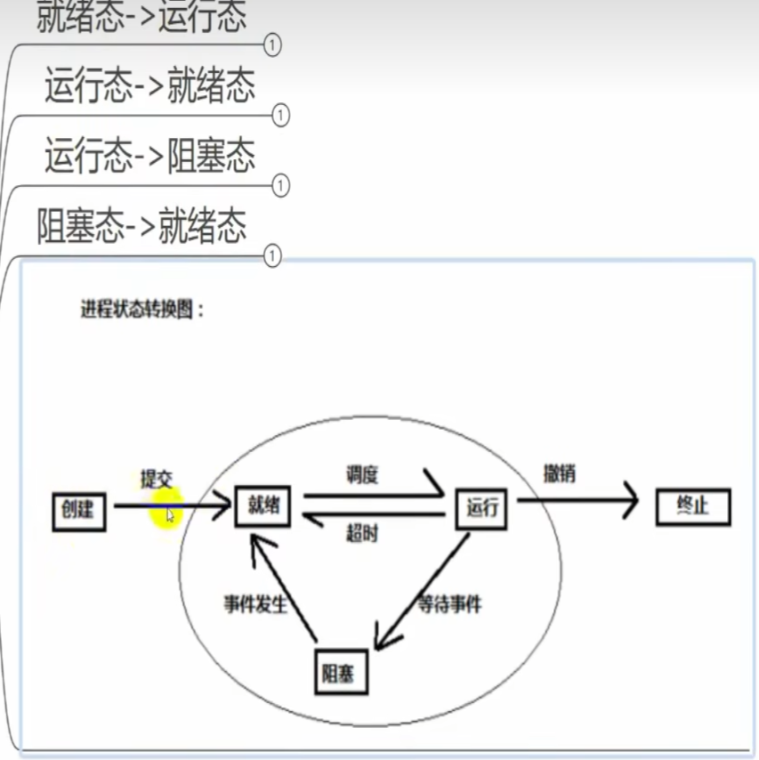 就绪态:进程已处于准备运行的状态,即进程获得了除处理机外的一切所需资源,一旦得到处理机即可运行