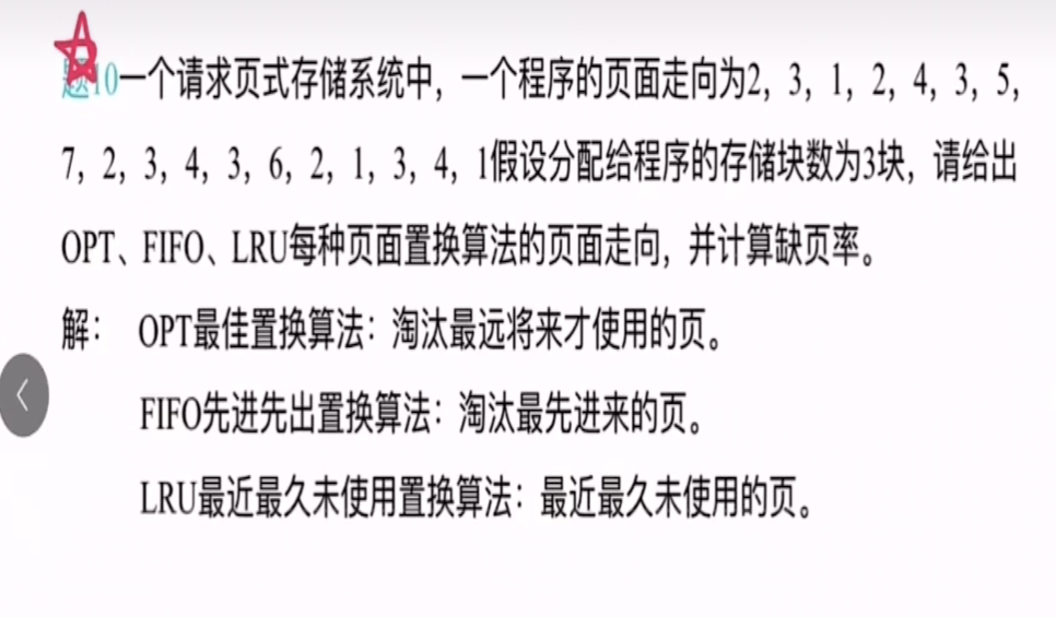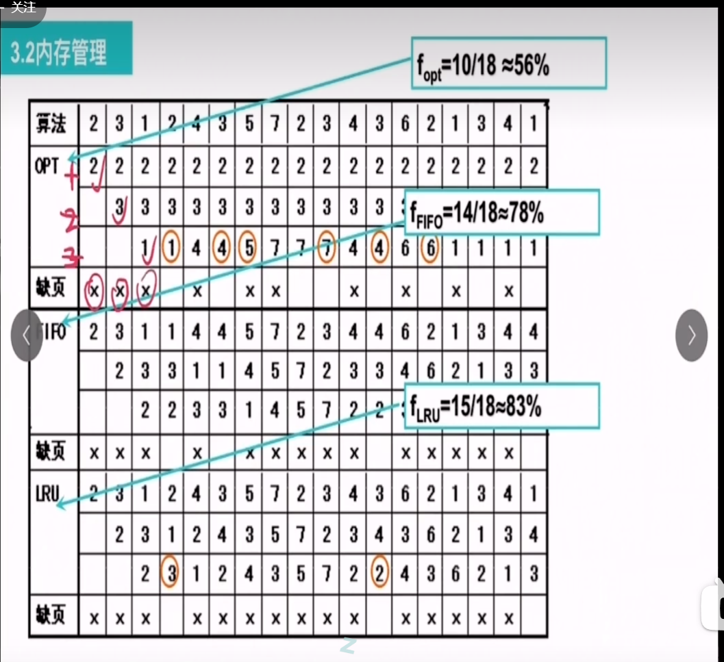 OPT(最佳置换算法):2,3,1直接进因为都是缺页的,然后2再进来,2不缺页因为本身就有所以还是2,3,1,然后4进来发现缺页,根据OPT最佳置换算法挑选一个最远不会使用的,往后3有了,再往后2也有了,1在最后所以置换1,变成了2,3,4然后到3,3有不缺页。然后到5发现缺页,找最远不会使用的那就是4了,替换编程2,3,5。接着到7发现缺页,找一个最远的还是4,所以替换成了2,3,7.接着又进来一个2不缺页,又进来一个3不缺页,进来4发现缺页。找一个最远不会用的,3有了,2有了,只有7能替换那就是7了,把7替换掉变成了2,3,4...........一直到倒数第二个1进来发现缺页,此时内存中是2,3,6. 往后找3有了,2,6没有把6替换掉变成了2,3,1。接着3进来不缺页还是2,3,1.然后4进来缺页,1有了,差2,3,把3替换掉变成2,4,1,1进来不缺页本身就有。