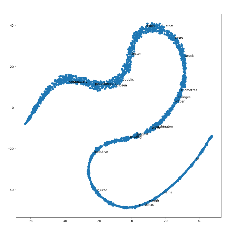 通过使用TSNE将单词的维数减少到2维,可以可视化模型制作的单词嵌入。
