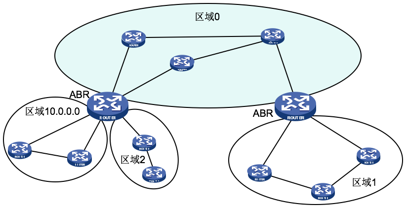 在OSPF区域中,区域0规定为骨干区域,其他都是普通区域。如果网络中OSPF只有一个区域,那么这个区域ID无论是什么都行。但如果存在多个区域,则骨干区域(区域0)必须存在且只能有一个,其他区域必须和区域0通过ABR(区域边界路由器)相连。