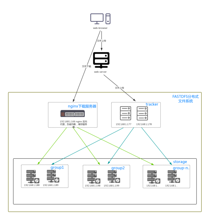 如何搭建FastDFS?参考我博客的这篇文章FastDFS 集群 安装 配置 ,下图为某用户搭建的架构示意图