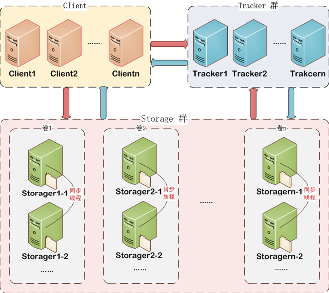 写文件时,客户端将文件写至group内一个storage server即认为写文件成功,storage server写完文件后,会由后台线程将文件同步至同group内其他的storage server。