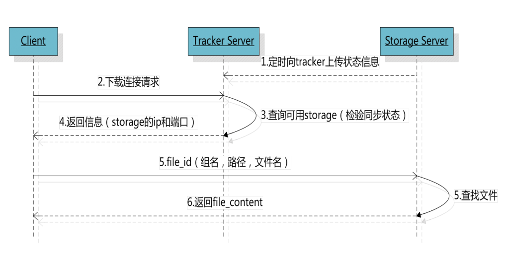 客户端带上文件名信息请求Tracker服务获取到存储服务器的ip地址和端口,然后客户端根据返回的IP地址和端口号请求下载文件,存储服务器接收到请求后返回文件给客户端。