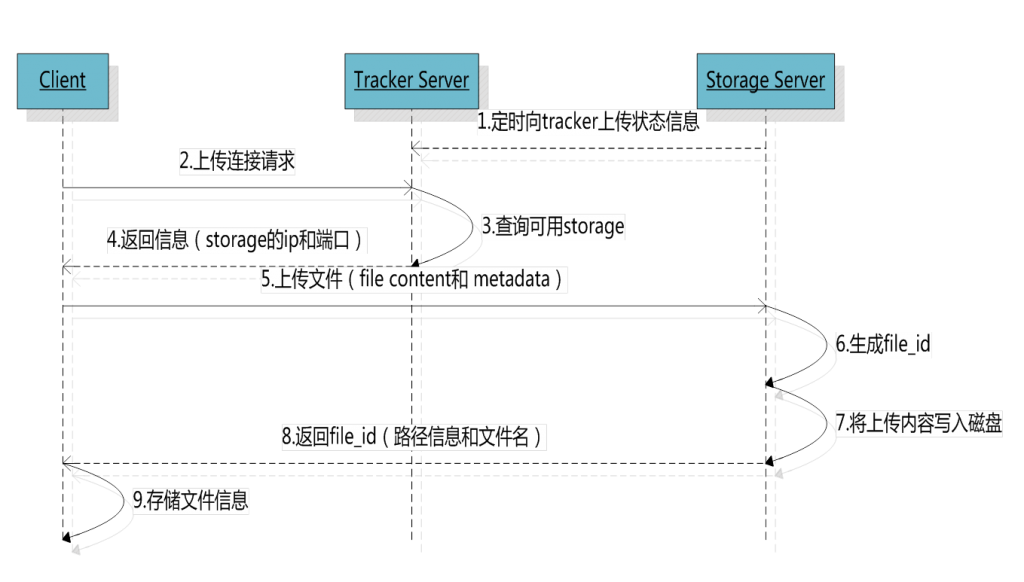 首先客户端请求Tracker服务获取到存储服务器的ip地址和端口,然后客户端根据返回的IP地址和端口号请求上传文件,存储服务器接收到请求后生产文件,并且将文件内容写入磁盘并返回给客户端file_id、路径信息、文件名等信息,客户端保存相关信息上传完毕。