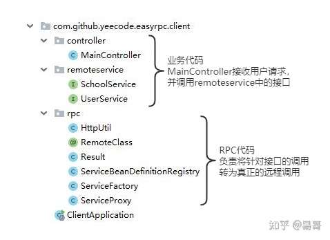 下面是客户端的代码,看着类有点多,其实代码不长。其中的RPC代码完成完成动态代理、远程调用参数序列化、远程调用发起、远程调用结果反序列化的工作。