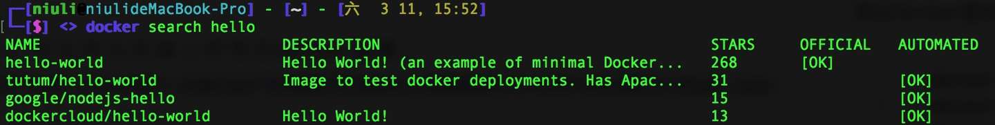 使用docker search 镜像名查找某一镜像,例如查找hello world,可以看到带有OFFICIAL的为官方提供的镜像.