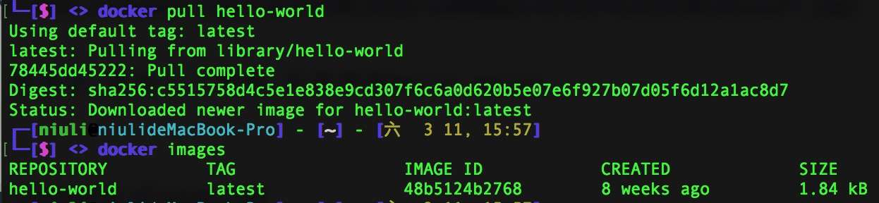 使用docker pull 镜像名获取一个镜像,这里获取hello world,另外镜像后可以跟版本号,例如docker pull redis:3.2,就指定拉去redis3.2版本