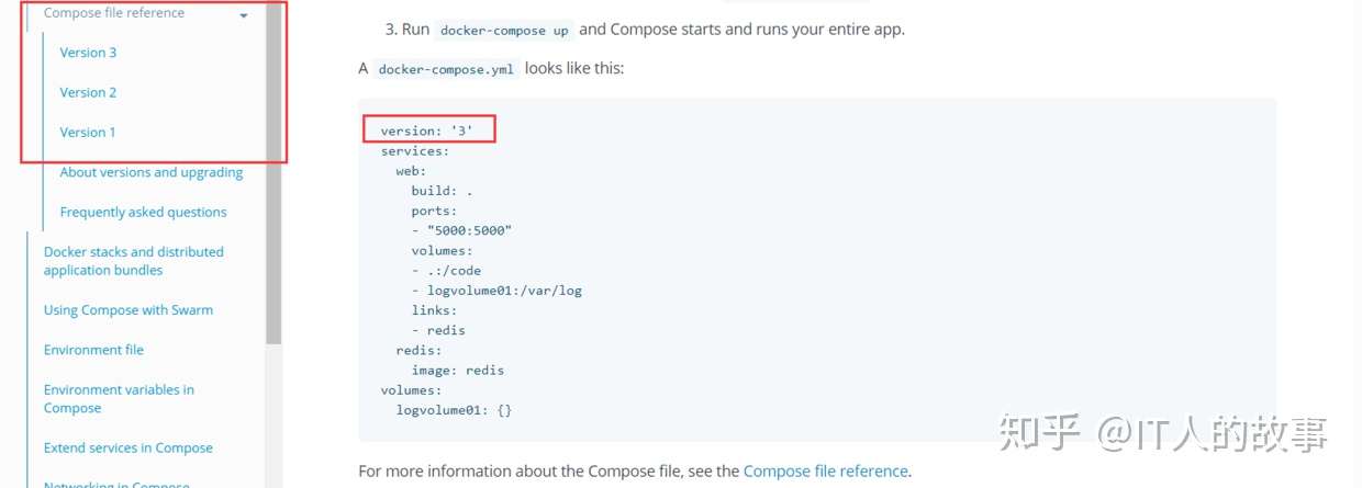 https://docs.docker.com/compose/overview/ ,version版本统一用3,其实3是兼容2的,version版本1 就不要考虑了已经废弃了,一定要往前看。3和2的最大区别是3比2强大,好像是废话,3支持多机和单机,2仅支持单机。