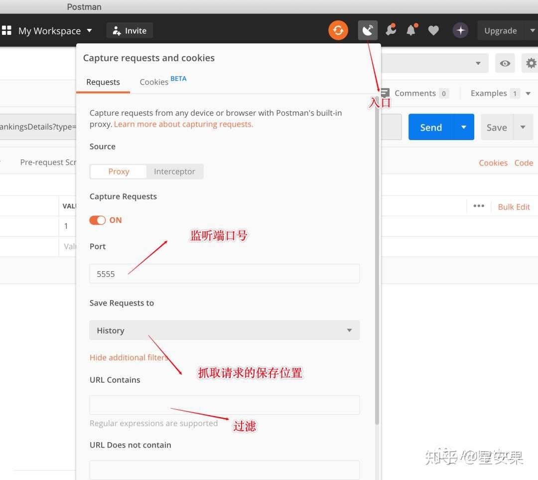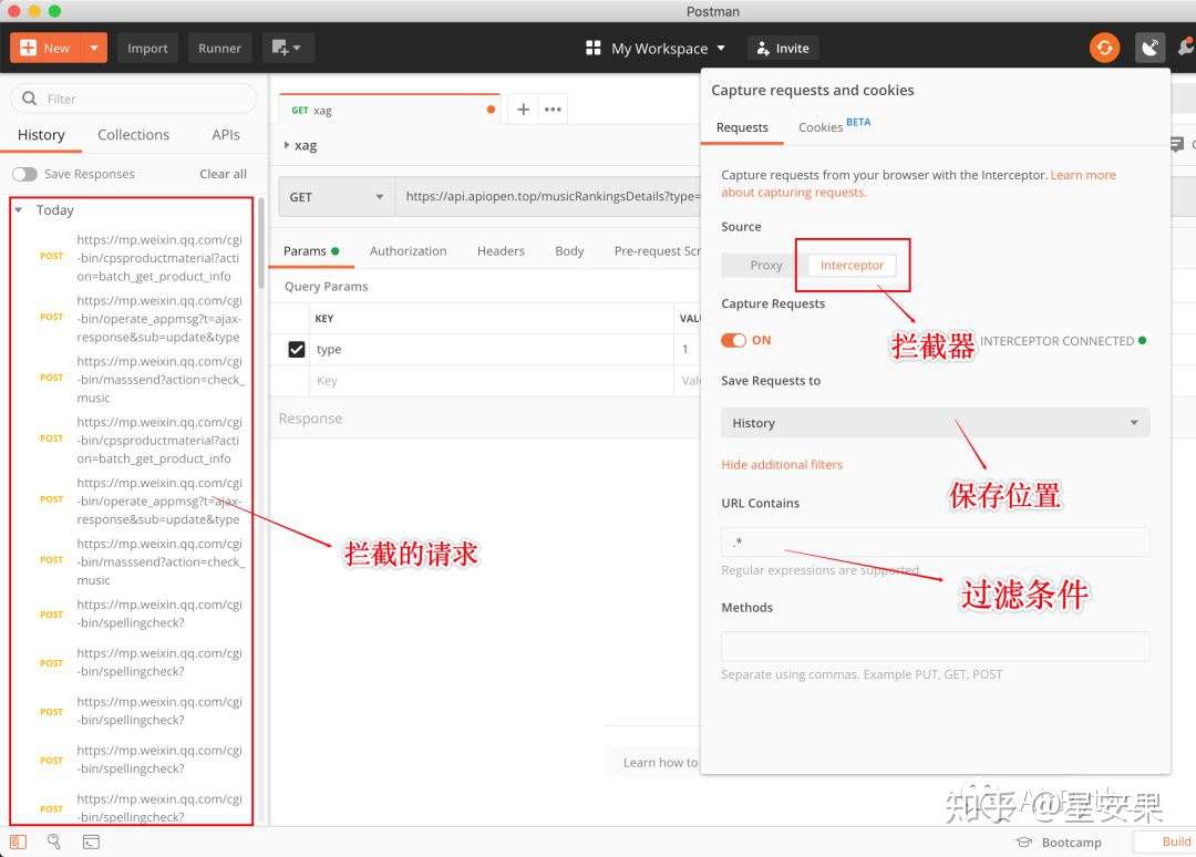 另外,Postman 中的拦截器,即:Interceptor,根据过滤条件,拦截 PC 端对应的网络请求,保存到左侧的请求历史记录中或请求集合下。