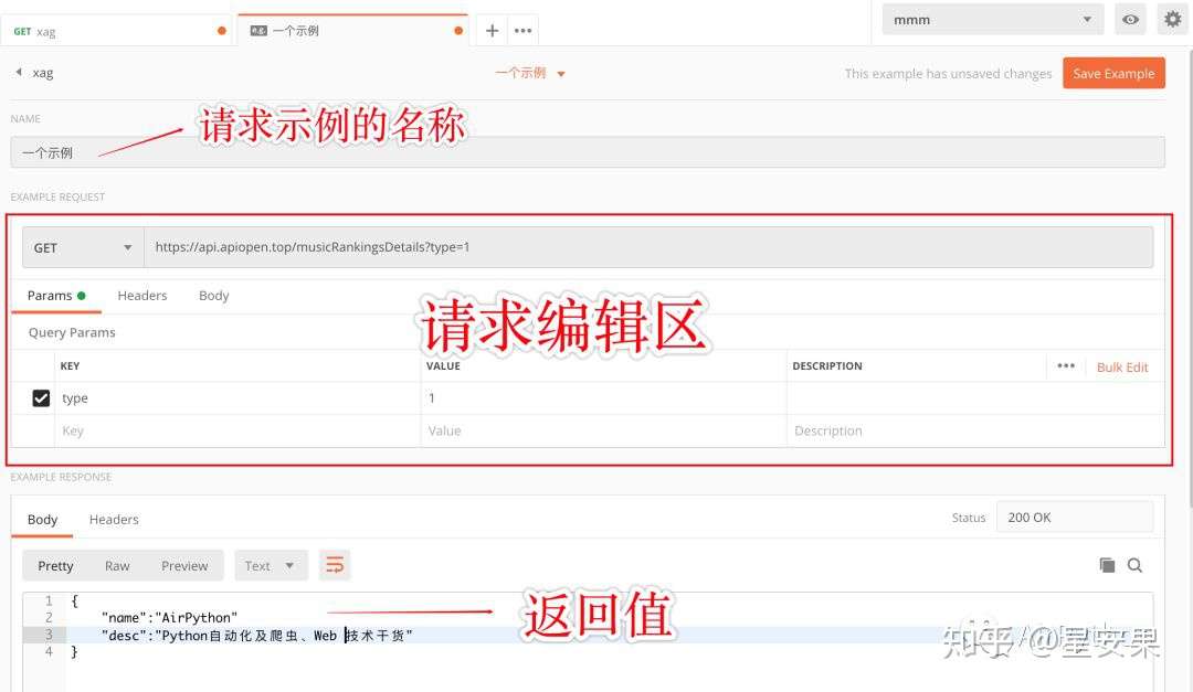 接着,为每一条网络请求新增一个示例 Example,加入 URL、请求头、请求参数及预设的返回值。