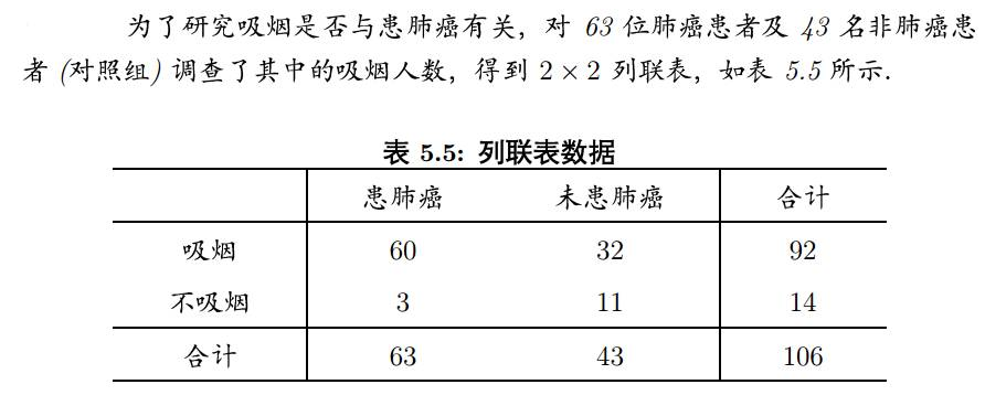 列联表是啥刚才已经解释过了,我们常见的就是2x2的列联表形式,还是吸烟与肺癌的例子: