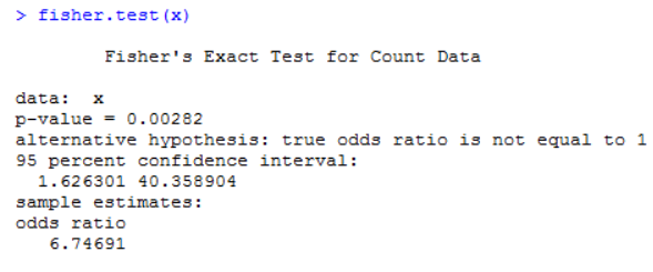 检验列联表数据时,我们还常会用到Fisher检验,该检验是建立在超几何分布的基础上,当样本量比较小时(这里有个经验值,频数小于4),一般建议使用该检验方法。