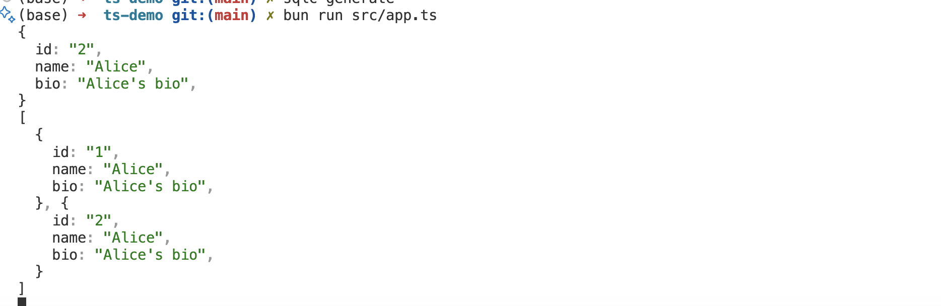 let inserted = await createAuthor(sql, {name: "Alice", bio: "Alice's bio"})