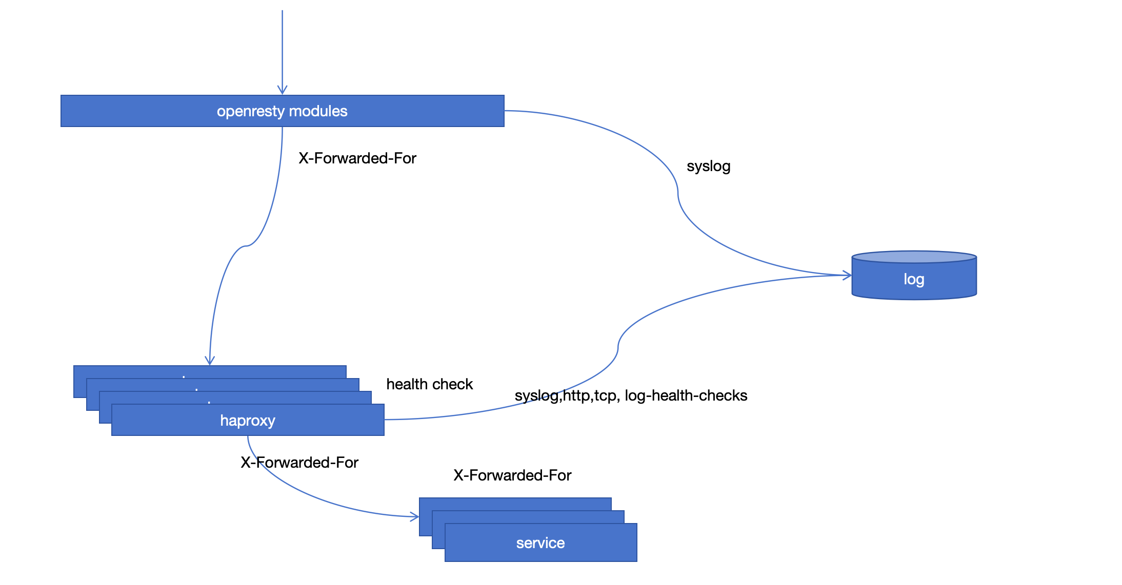 简单说明: nginx 使用openresty 这个版本,同时开启X-Forwarded-For header 方便服务获取真是ip,对于各层集合log 能力以及syslog 方便进行业务日志记录,当然对于haproxy 会结合实际业务场景,开启tcp,http,以及health-check 的日志