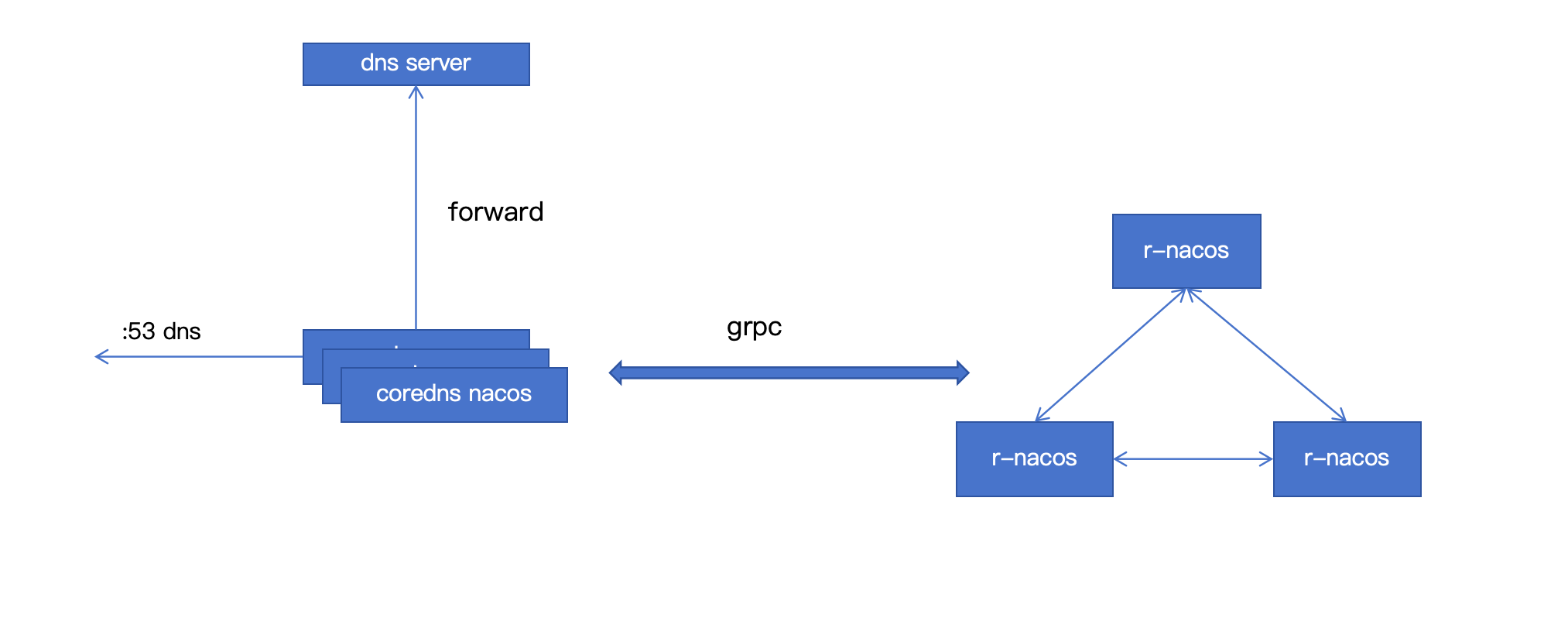 简单说明: 对于r-nacos 部署一个集群,cordns nacos plugin 通过grpc 协议访问,同时配置forward 转发,对于服务的注册推荐基于约定的规则(类似域名模式),对于非规则的通过forward 到其他上游dns server 中
