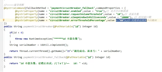 @HystriProperty(name=”execution.ioslation.thread.timeoutInmolliseconds”,value=”3000”)//意思为设置该方法的超时时间,如果超时了,当成异常
