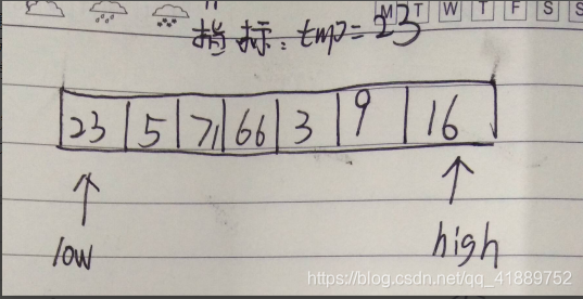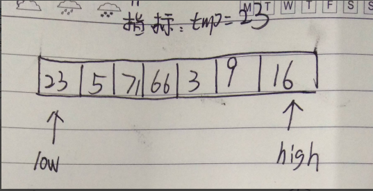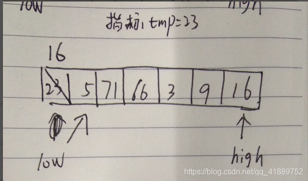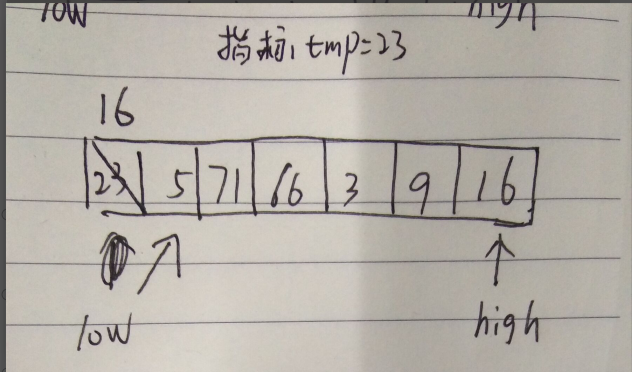 3.此时比较low指针和指标的大小,如果low指向值大于指标值(23),将low复制给high指向值,high向左移一位。如果low指向值小于指标值(23),low向右移动一位。直到low=high,将指标值赋给low指向的数组下标。结束一次的排序