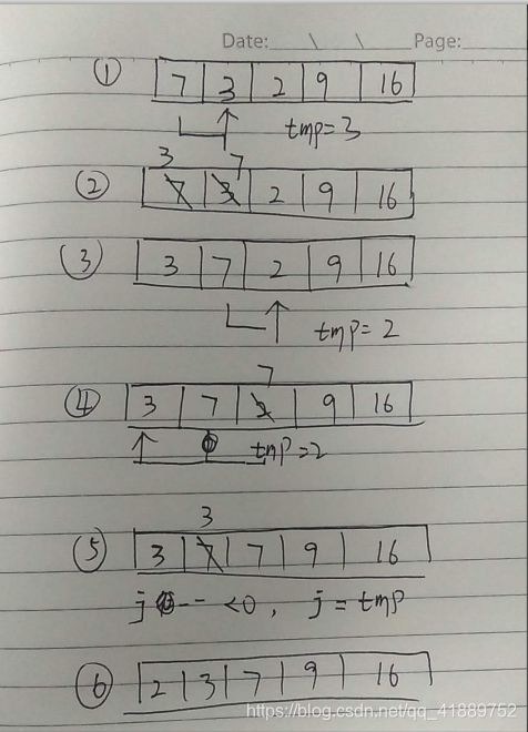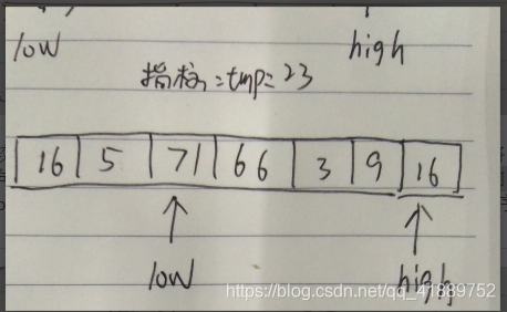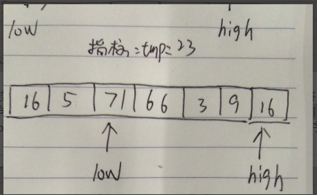 2.从右边high指向的值和tmp比较,high小则值复制给low,low向前移一位,且一下次从low位置开始比较,大于等于则high指针向左移一位,继续比较