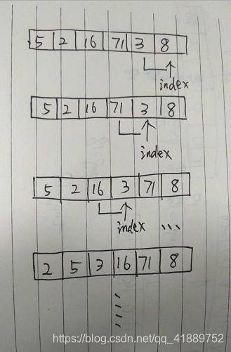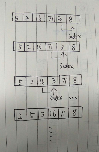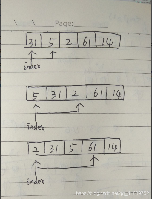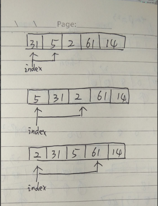 1.指针(index)指向数组最左边,将指针指向元素和index+1元素一次进行比较,如果元素小于指针元素,互换位置(5比31小互换位置)