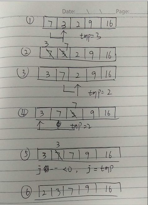 1,。索引刚开始指向下标为1的,从索引左边数组最右边(下标设为j)开始比较(第一次左边数组只有一个元素,将索引值(3)存入tmp)==如果对比值大,对比值赋值给他的后一位。然后对比值下标减一(第一次j=0,减一后为-1,结束循环)。然后将tmp的值赋给j+1