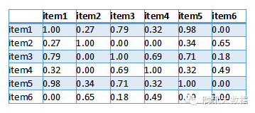 基于物品的CF计算方式大致相同,只是关联矩阵变为了item和item之间的关系,若用户同时浏览过item1和item2,则(1,1)的值为1,最后计算出所有item之间的关联关系如下: