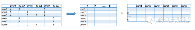 对于矩阵稀疏的问题,有很多方法来改进CF算法。比如通过矩阵因子分解(如LFM),我们可以把一个nm的矩阵分解为一个nk的矩阵乘以一个k*m的矩阵,如下图: