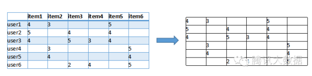 首先我们根据网站的记录计算出一个用户与item的关联矩阵,如下: