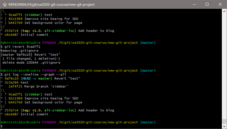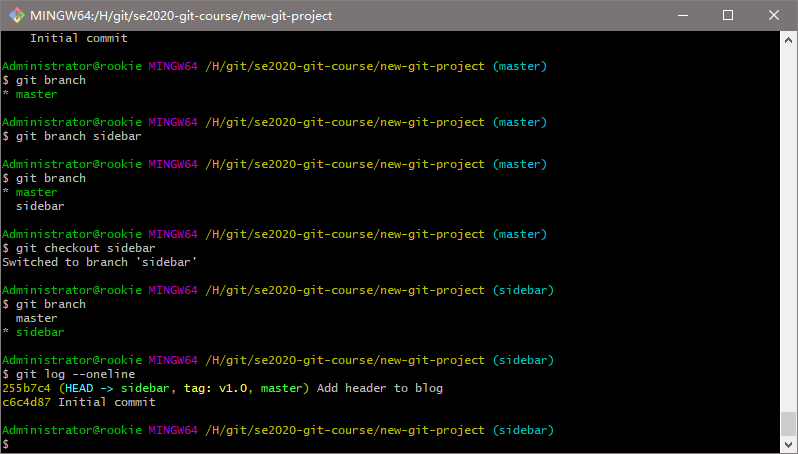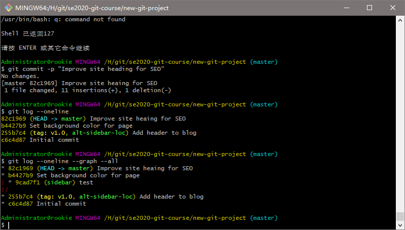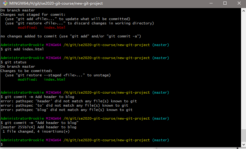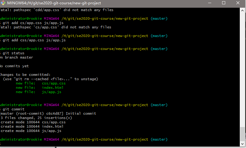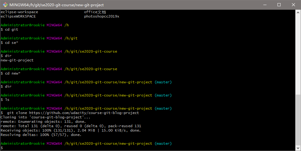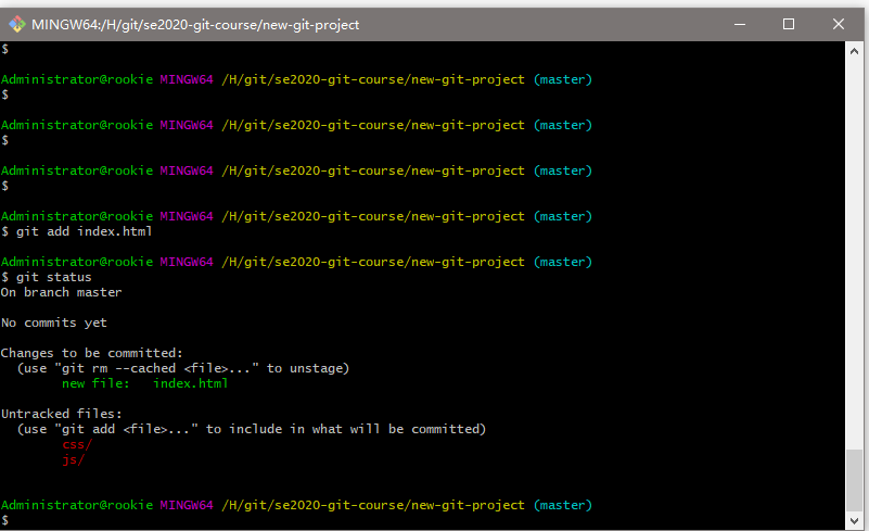创建一个目录,叫做 se2020-git-course,在该目录中,创建另一个目录,叫做 new-git-project,使用 cd 命令移到 new-git-project 目录下。