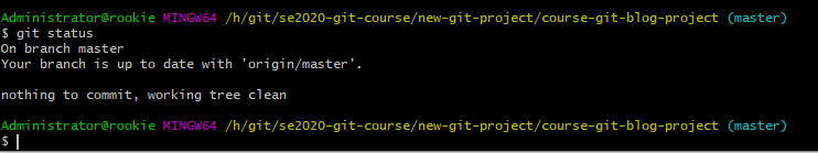 Your branch is up-to-date with 'origin/master'. – 因为我们使用 git clone 从另一台计算机上复制了此仓库,因此这部分告诉我们项目是否与所复制的仓库保持同步状态。我们不会在其他计算机上处理该项目,因此这一行可以忽略。