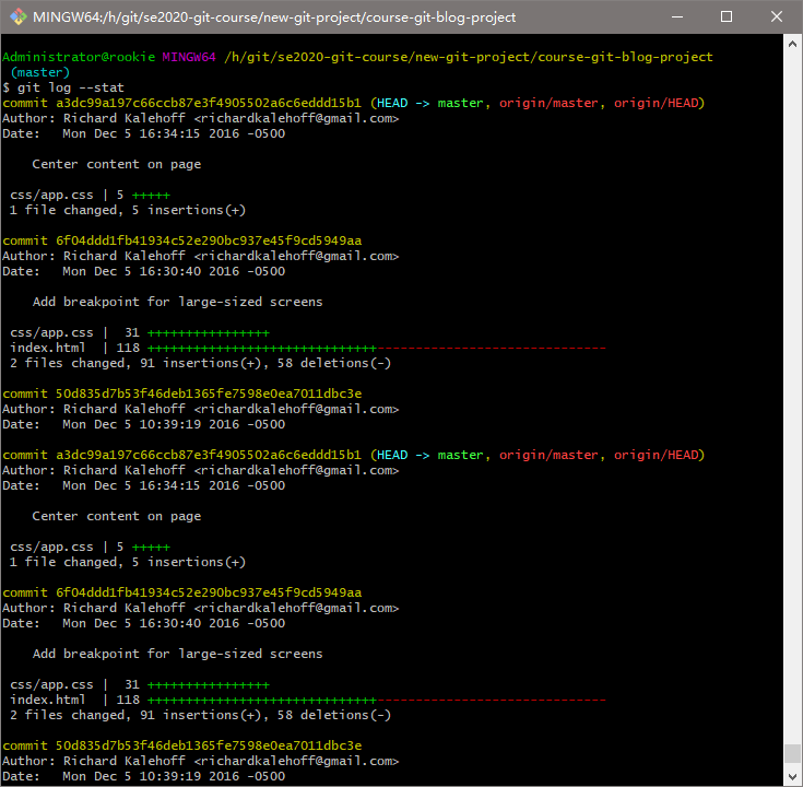 作者 - git log 输出结果显示了每个 commit 的作者!其他仓库可能有多个人协作,因此情况可能不同,但是对于此仓库,只有一个人提交了所有的 commit,因此所有 commit 的作者是一样的。我们需要查看每个 commit 的作者吗?如果我们想隐藏这一信息呢?